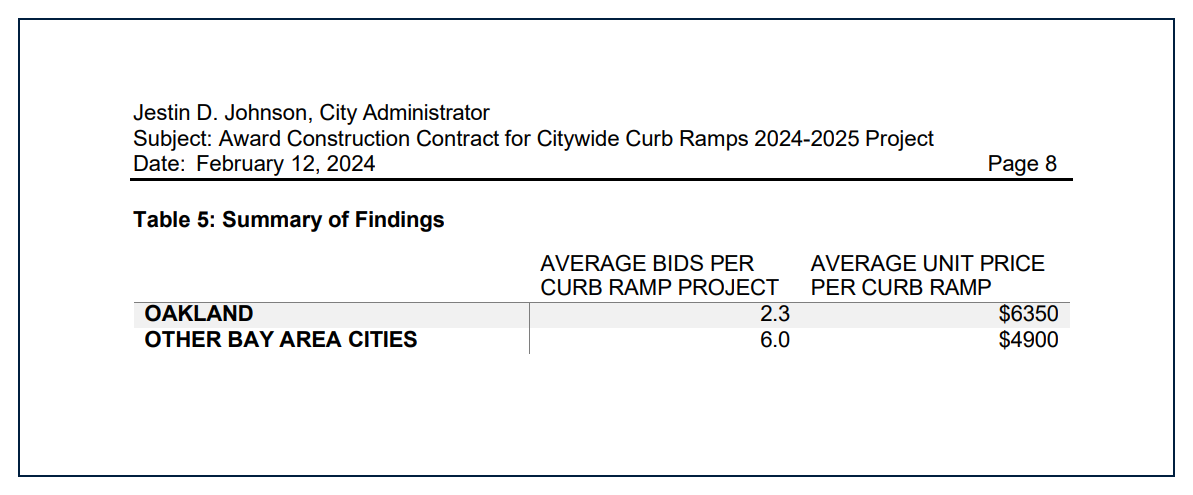 Another significant issue is who gets construction contracts and how much they cost. Oakland's rules for who qualifies to apply for contracts are much stricter than similar cities. These rules, and the fees and paperwork involved, often end up discouraging exactly those small, local businesses these policies are meant to assist. As a result, many contracts end up with two, or one, or zero qualified bidders. And those few bidders can confidently charge 25 - 35% more than the same companies charge neighboring cities for exactly the same work! (According to figures supplied by the City itself.)